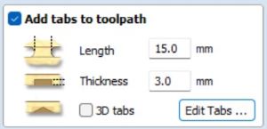 Athugið! Mikilvægt er að bæta við töppum með því að haka við Add tabs to toolpath. Þessir tappar tryggja að hlutir fari ekki á fleygiferð þegar þeir eru fræstir.