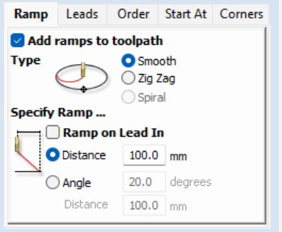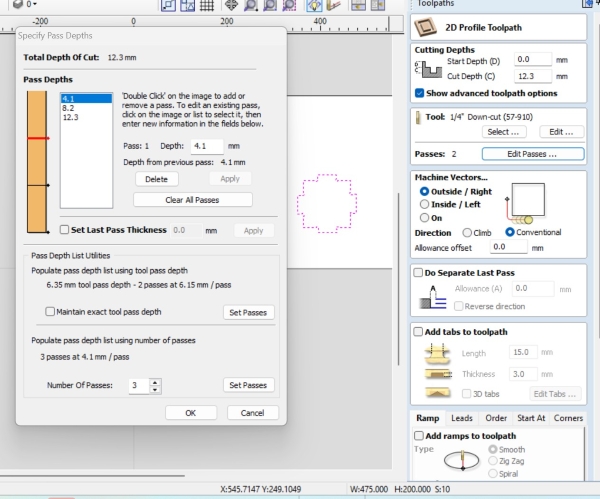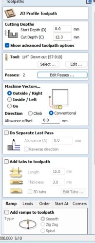 Hér er dæmi þar sem 2D Profile path var notað til að hanna fræstan prófíl. Upphafsdýptin var stillt á 0.0mm. Þykktin á efninu var um 12.1mm svo skurðardýptin var stillt á 12.3mm til að fara örugglega í gegnum efnið.