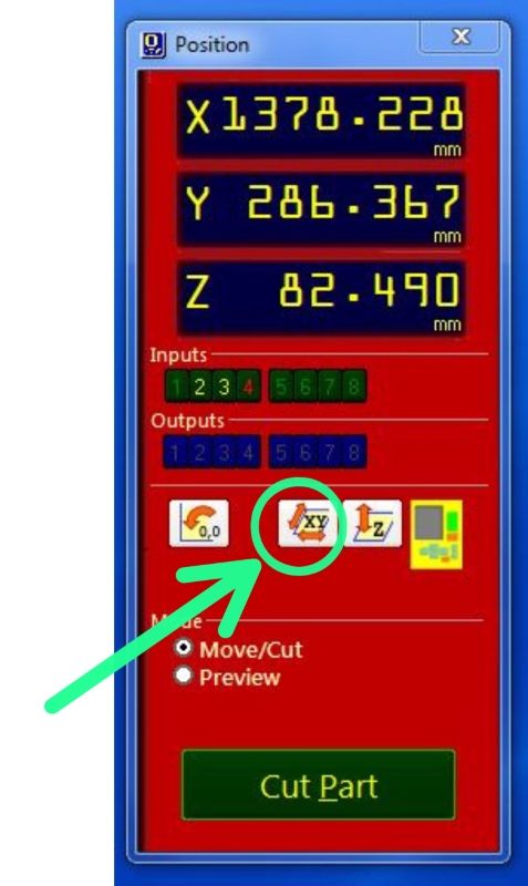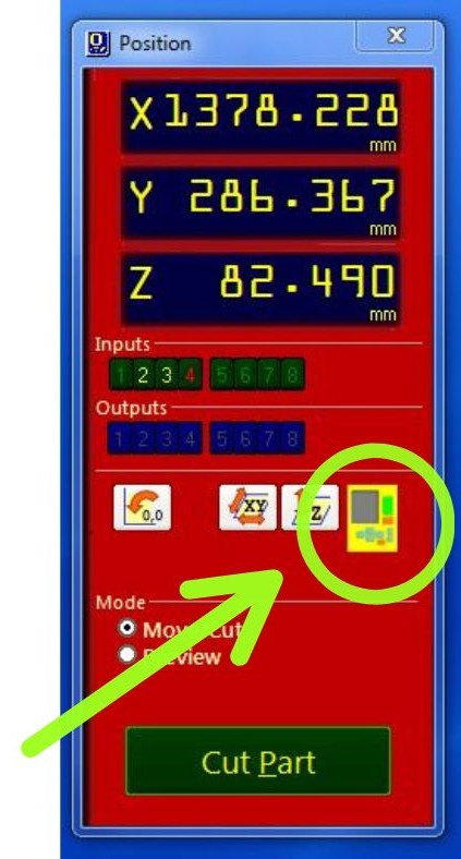 Now the machine is ready to start machining or cutting. Close the yellow keypad. Then you click on the Cut Part button, find the job you want to do and double-click on it. Then you click on the Green Start button.