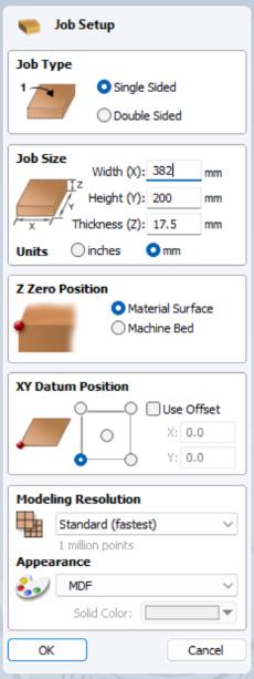 - Stærð vinnusvæðisins er stillt. Þetta svæði á að vera stærra en svæðið sem verður skorið/fræst. Þetta getur t.d. verið stærð efnisins sem notað verður, nema efnið sé mikið stærra. Þá getur hugsanlega verið hentugt að stilla vinnusvæðið 10mm stærra á lengd og breidd (eða meira).
