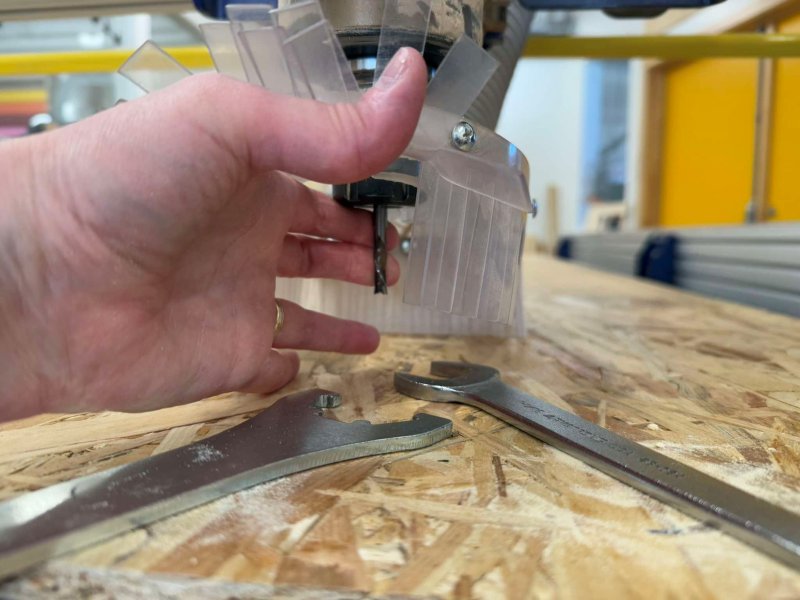 Áður en fræsitönnin er fest í þarf að banka collettunni aðeins í borðið og blása inn í hana til að tryggja að ekkert sag sé í henni. Annars er hætta á að hún herðist ekki nógu vel utan um fræsitönnina.
