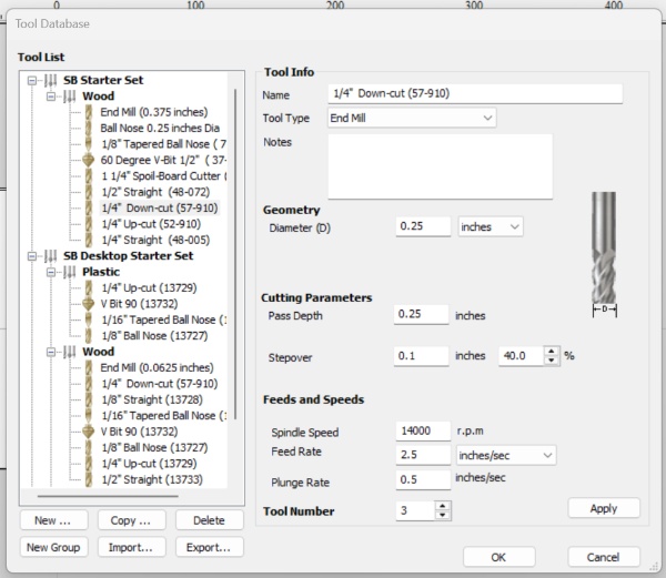 Við erum með ShopBot PRS-alpha tölvustýrðan fræsi með 1440 x 2190 x 150 mm vinnusvæði. Hægt er að lesa bækling um ShopBot fræsinn hér. Í bæklingnum er tekið fram að til að ná fram gæðaskurði er mikilvægt að velja réttan hraða fyrir hvern skurð (feed rate) og snúning á spindli/RPM. Talað er um Move speed þegar verið er að skera eða fræsa efni, eða Feed rate. Talað er um Jog speed þegar tækið hreyfist en er ekki að fræsa eða skera efni. Í bæklingnum er vísað í vefsíðuna Onsrud.com fyrir nánari upplýsingar um viðeigandi stillingar.