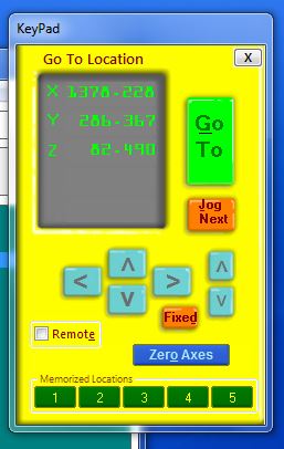 Move the tool to the point over your material where you want the zero point to be. Make sure that it is the same X- and Y- point that you used in job setup in VCarve. Click on the small blue button on the Yellow keypad, marked as Zero axis. Then you put a checkmark in the boxes in front of the X- and Y- axis (NOT the z-axis!). Then you click on Zero.