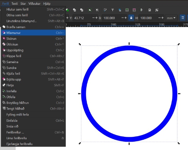 - Smelltu svo á Ferill (Path) og svo Mismunur (Difference). Þá verður minni hringurinn að gati.