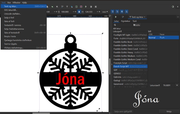 Þú getur einnig smellt á Texti og letur (Text and font). Þannig getur þú valið á mismunandi leturgerðir og séð hvernig það mun líta út.
