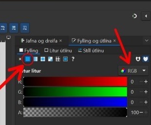 Fyrst þarftu að smella á Hlutur (Object) og svo Fylling og útlína (Fill and stroke). Þú smellir á þann flipa sem þú ætlar að vinna með.